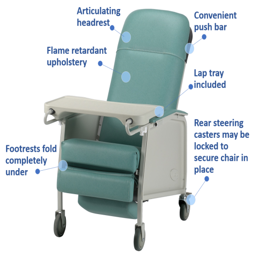 The Invacare Traditional Three-Position Recline offers exceptional comfort and durability for day room or resident room environments. The full recline, leg-ottoman elevated and full upright positions provide maximum flexibility for users. A convenient push bar on the chair back and four rolling casters allow for easy movement.